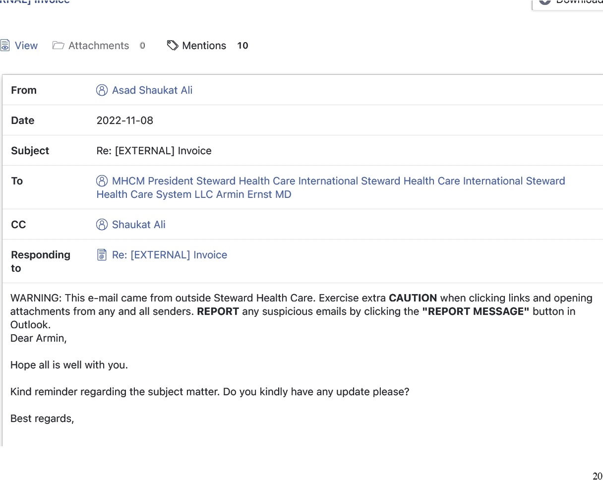 It was two months later, in November, that Shaukat Ali emailed Ernst to request payment due from their 30-percent participation rights in Steward Malta — “in order for us to keep receiving funds as everyone else is getting paid from this operation.”