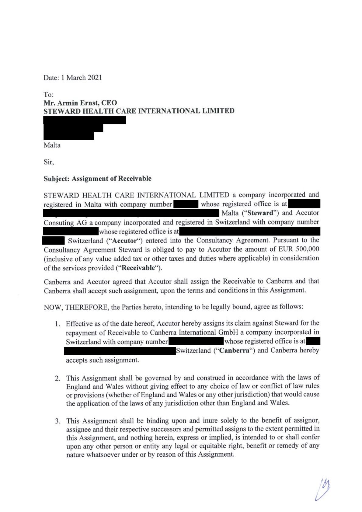 In a document from March 2021, Accutor and Canberra asked Steward to reassign a 500,000-euro debt for consulting fees it owed from Accutor to Canberra. And a leaked email sent to Armin Ernst containing payment records shows that around 1 million euros in consulting fees were paid to Canberra through Spain’s Santander bank and Bank of America in separate payments throughout 2021.