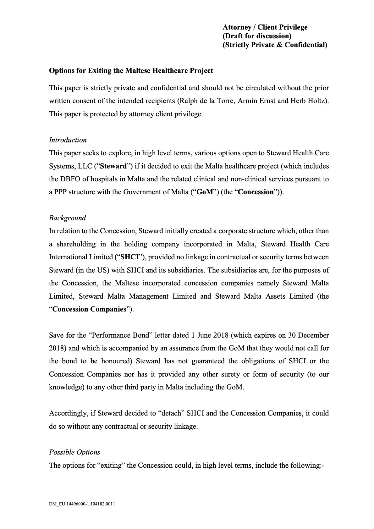 Maltese media have reported that government officials had promised Steward a payment of 100 million euros if its contract was canceled, but a leaked document obtained by OCCRP provides new details on what Steward — and its silent partners, the Alis — might have envisioned receiving. The undated document, marked as “Strictly Private and Confidential” and sent to Ernst, Steward CEO Ralph de la Torre, and general counsel Herb Holtz, noted that if the Maltese government terminated the deal and was at fault, Steward would receive “Lender’s Debt plus EUR 100M.”
