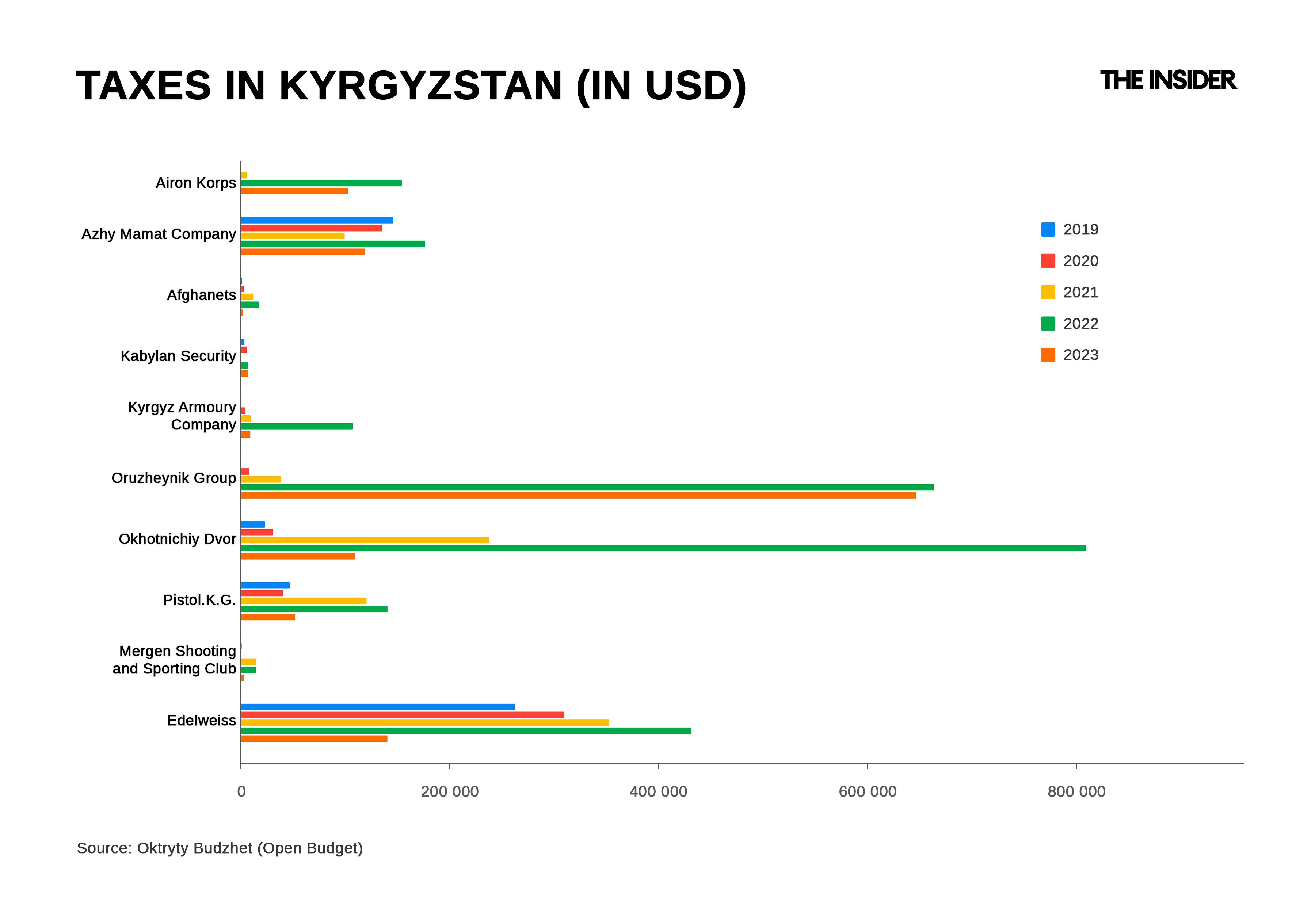 According to the company’s tax reports, Edelweiss’s business has boomed since the full-scale war began: its tax payments jumped from 20.03 million som (over $230,000) in 2020 to 37.91 million som (more than $435,000) in 2023. Overall, Kyrgyz arms importers paid 385% more in taxes in 2023 than they did in 2021, and Kazakh importers’ tax payments increased by 99%.