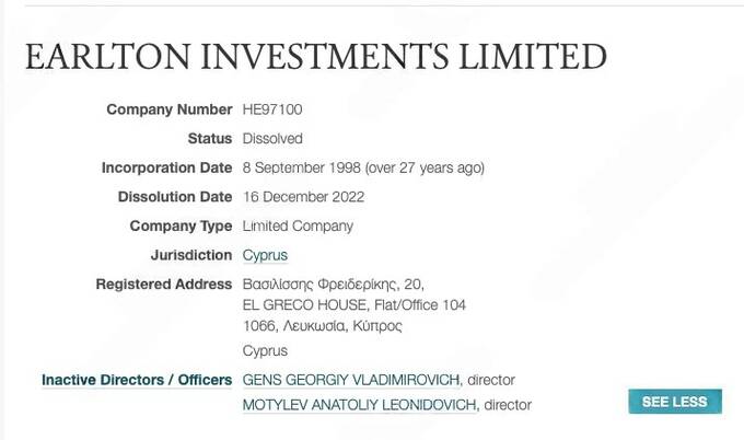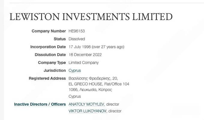 Gens, the former owner of the Lanit Group of Companies, also controlled Motylev’s Globex Bank. Despite Gens’s death in 2018, Earlton Investments Ltd. remained active until the end of 2022. Another Cyprus offshore company, LEWISTON INVESTMENTS LIMITED, belonged to Motylev and Viktor Lukoyanov. Lukoyanov was Motylev’s partner in Rossiysky Kredit Bank, from which they siphoned off approximately 35 billion rubles.
