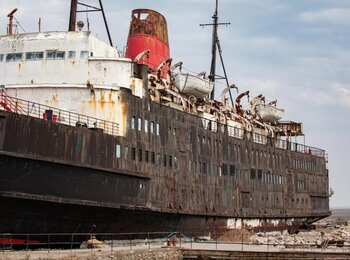 Eerie images have emerged that showcase a once deluxe passenger cruise ship slowly decaying after being dry docked 45 years ago.